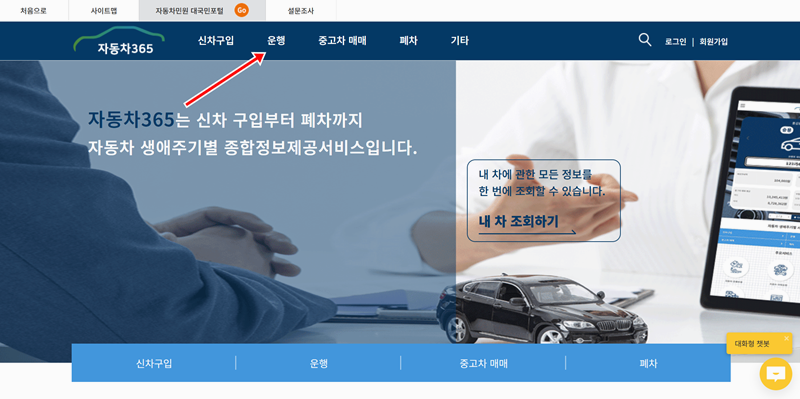 2. 홈페이지에 접속하면 상단 메뉴가 보이는데 신차구입, 운행, 중고차 매매, 폐차, 기타로 나눠져 있어요. 여기서 압류 조회를 하려면 운행 메뉴로 이동하면 돼요. 메뉴가 깔끔하게 정리돼 있어 찾기 어렵지 않아요.