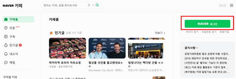 4. 네이버 카페를 이용하는 경우에는 먼저 포털에서 네이버 카페를 검색해 접속합니다. 카페 메인 화면에서 로그인하면 됩니다.