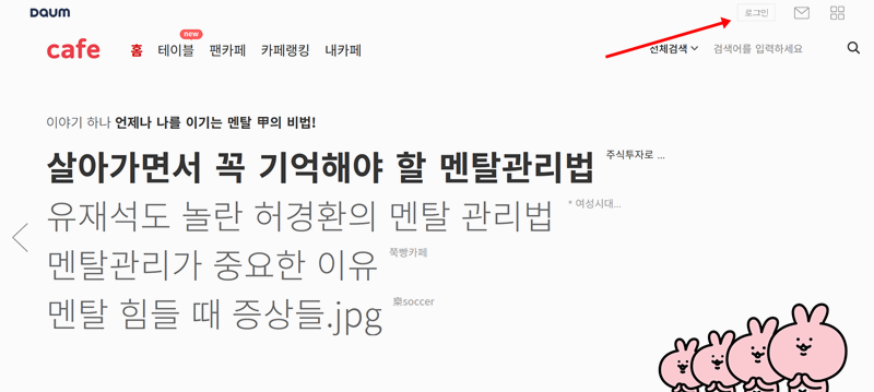 1. 다음 카페에 접속하면 상단 메뉴에서 로그인 상태를 확인할 수 있습니다. 로그인이 안 된 경우 먼저 카카오 아이디로 로그인해 주세요.