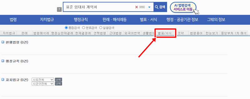 2. 검색 결과가 나타난 상단 메뉴 중 '별표/서식'을 선택하면 법령 문서 외에도 실제 계약서 서식이 정리된 자료 탭으로 이동할 수 있습니다.