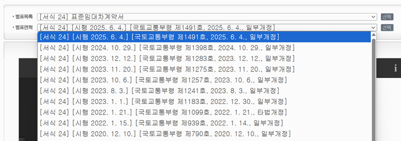 7. 계약서는 시행일자별로 정리돼 있고, 원하는 날짜를 선택하면 그 시점에 맞는 계약서 양식이 화면에 표시되어 최신 내용을 기준으로 문서를 열람할 수 있습니다.