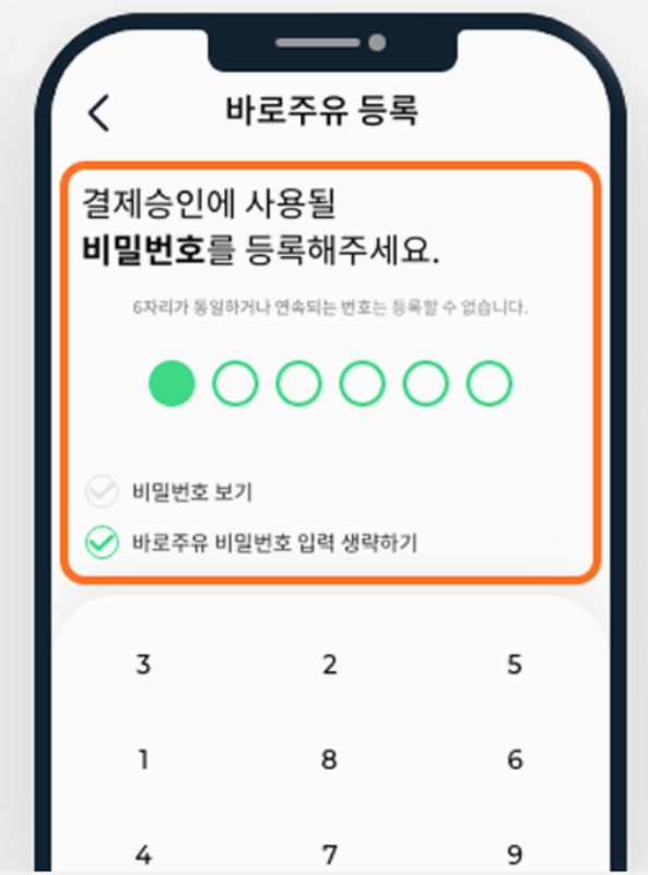 6. 결제를 위한 비밀번호도 등록해야 해요. 총 6자리 숫자로 설정하게 되며, 연속되거나 동일한 숫자는 등록이 되지 않으니 참고하시면 됩니다.