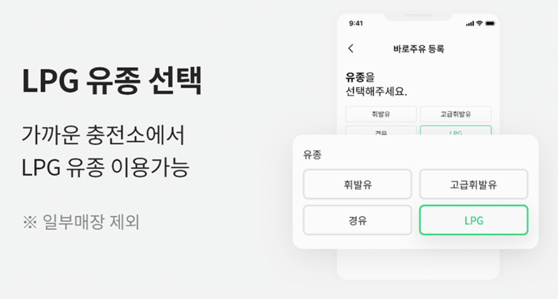 9. 마지막으로 유종 선택도 다양하게 가능해요. 휘발유는 물론이고 고급휘발유, 경유, LPG 중에서 골라 사용할 수 있어요. 단, LPG는 가까운 충전소에서만 사용 가능합니다.