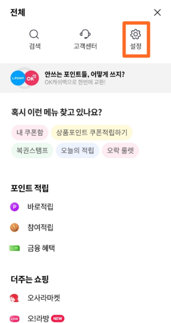 3. 전체 메뉴 중에서 ‘설정’을 선택하면 포인트와 관련된 다양한 관리 기능을 확인할 수 있어요. 필요할 때마다 편하게 접근할 수 있도록 구성돼 있어요.