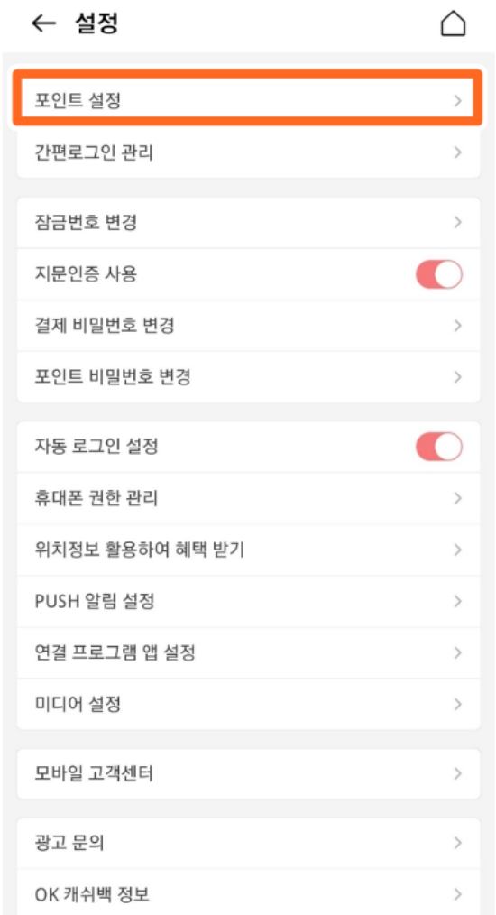 4. 설정 화면에 들어가면 '포인트 설정' 메뉴가 있어요. 여기에서 포인트 사용 및 이체와 관련된 항목들을 관리할 수 있어요.