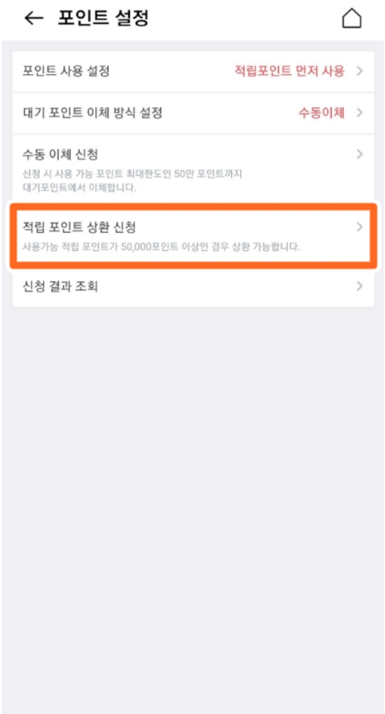 5. 포인트 설정 화면에서 '적립 포인트 상환 신청'을 누르면 현금처럼 사용할 수 있는 조건을 확인할 수 있어요. 5만 포인트 이상이면 신청이 가능해요.