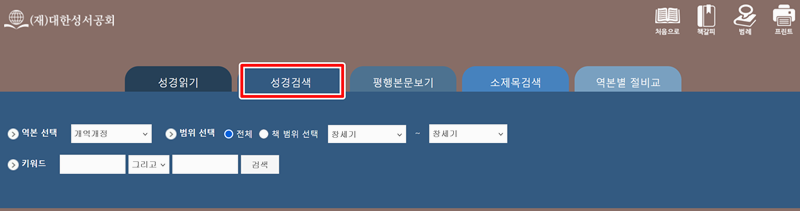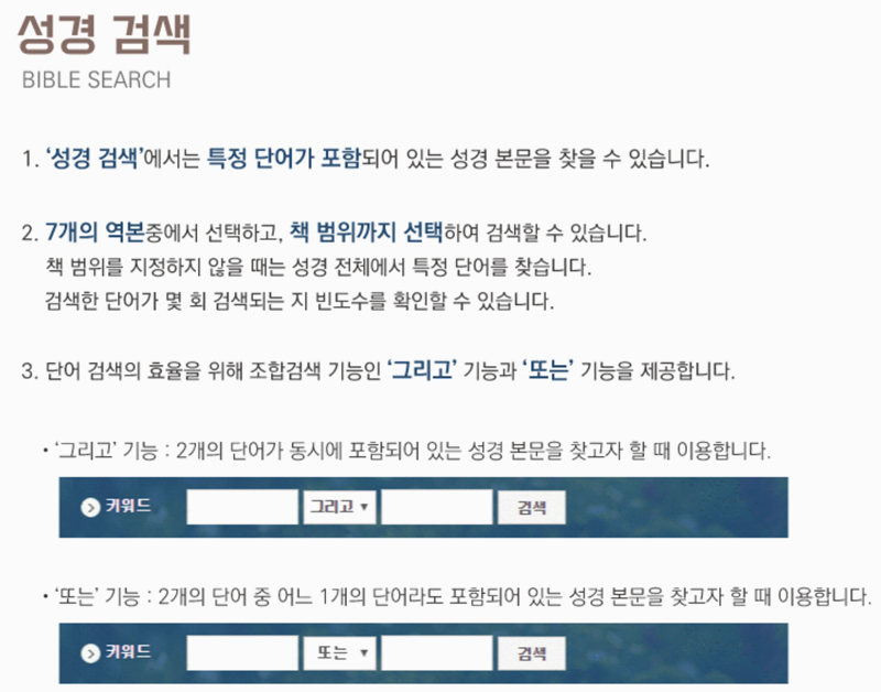 5. 성경 검색 메뉴에서는 원하는 키워드를 넣고 책 범위도 지정해서 찾을 수 있어요. 구체적으로 내용을 좁혀가며 검색할 수 있답니다.