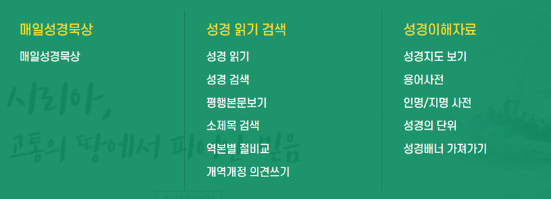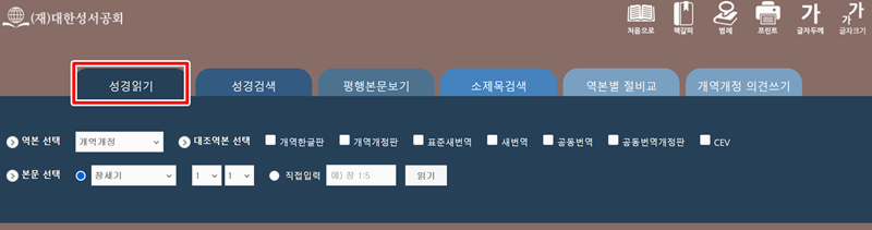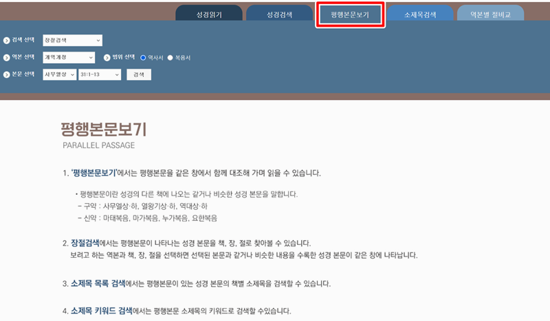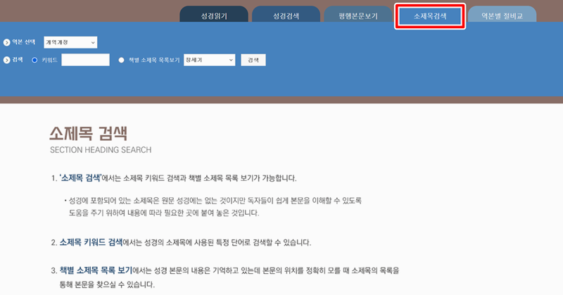 2. 성경읽기 메뉴에서는 성경 읽기 외에도 성경 검색, 평행본문 보기, 소제목 검색 등 다양한 기능들을 한눈에 볼 수 있게 되어 있어요.