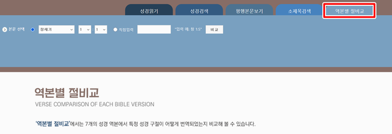 9. 마지막으로 역본별 절 비교 메뉴에서는 동일한 구절이 다양한 번역본에서 어떻게 표현됐는지 비교해서 볼 수 있어요. 구절의 뉘앙스를 다양하게 이해하는 데 도움이 돼요.
