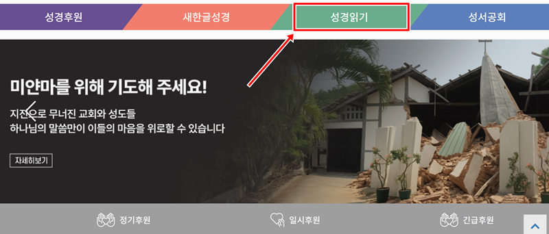 1. 처음 접속하면 여러 메뉴 중에서 성경읽기를 바로 선택할 수 있어요. 눈에 잘 띄는 위치에 있어서 찾기 어렵지 않아요.