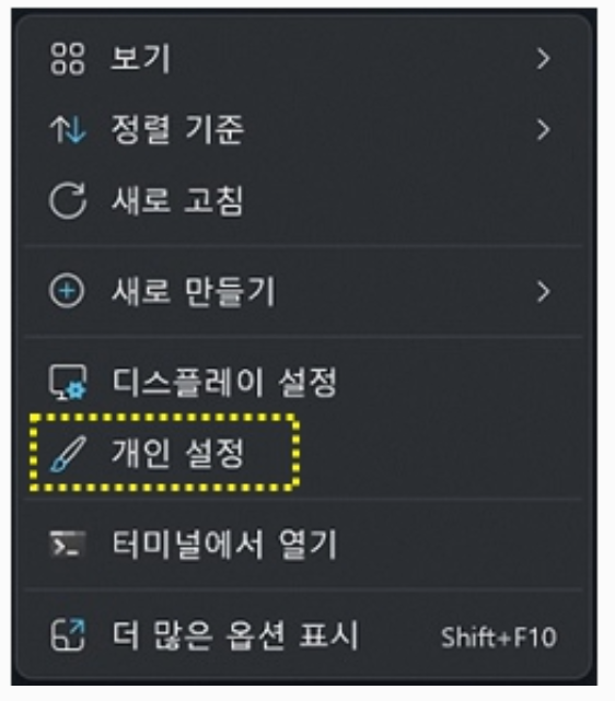 1. 윈도우11 바탕화면의 빈 공간에 마우스를 대고 오른쪽을 누르면 나타나는 메뉴에서 '개인 설정'으로 들어가 주세요. 모든 꾸미기는 여기서부터 시작됩니다.