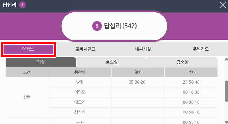 6. 선택한 역의 상세 화면으로 이동하시면, 상단에 '열차시간표'라는 부분이 있습니다. 이곳을 선택하면 평일, 토요일, 공휴일 등 요일별로 열차가 언제 운행되는지 자세한 시간을 보실 수 있습니다.