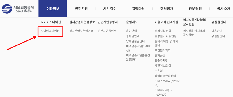 2. '이용정보'를 선택하시면 왼쪽에 펼쳐지는 여러 항목 중 '사이버스테이션'이라는 글자를 찾아 선택해 주세요. 이곳에서 노선도, 시간표, 역과 관련된 다양한 정보를 만나보실 수 있습니다.