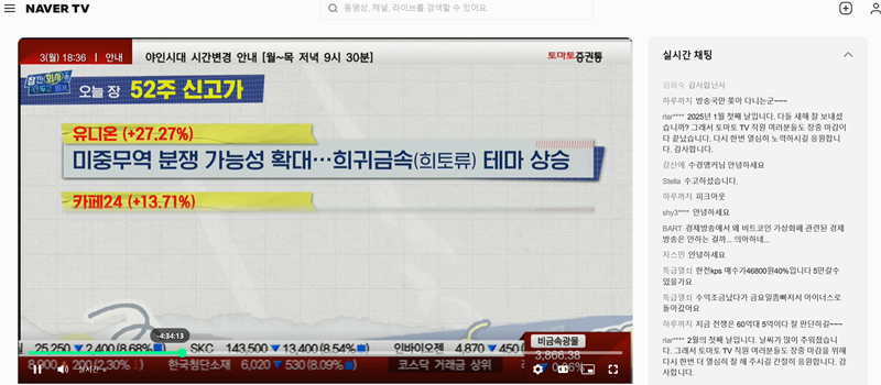 3. 실시간 방송은 별도의 가입 없이 누구나 자유롭게 볼 수 있어요. 하지만 채팅 기능을 이용하려면 네이버 아이디로 로그인해야 참여할 수 있으니 소통을 원한다면 먼저 로그인을 진행해야 해요.