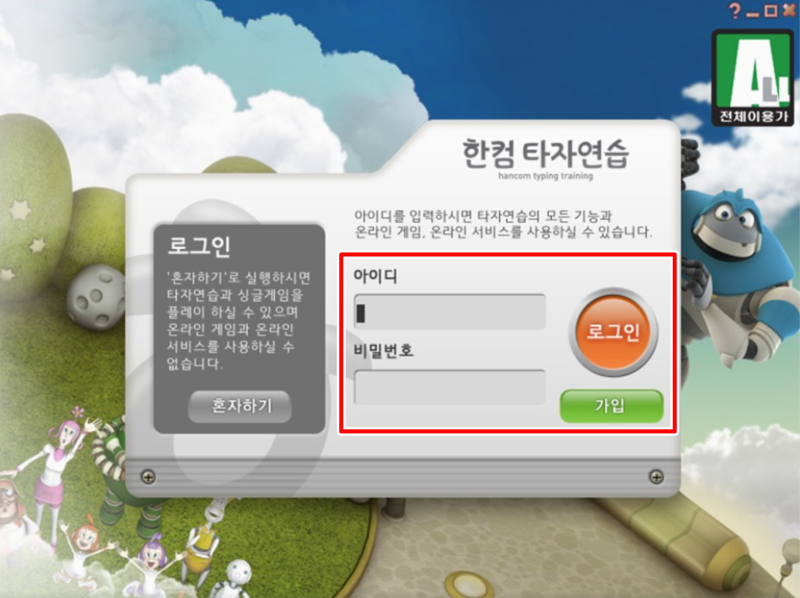 6. 연습 기록을 남기고 싶다면 아이디와 비밀번호를 입력해 들어갈 수 있어요. 하지만 꼭 가입하지 않고 '혼자하기'를 통해 바로 연습을 즐기는 것도 가능합니다.