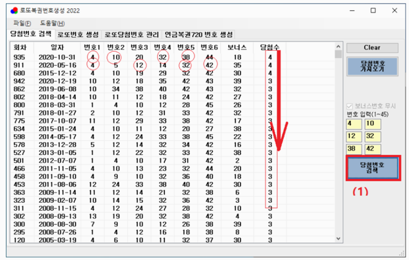 7. 보내온 번호들이 오른쪽에 자동으로 입력됩니다. 여기서 '당첨번호 검색'을 누르면, 과거에 해당 조합이 몇 등이었는지 바로 찾아볼 수 있어 편리해요.