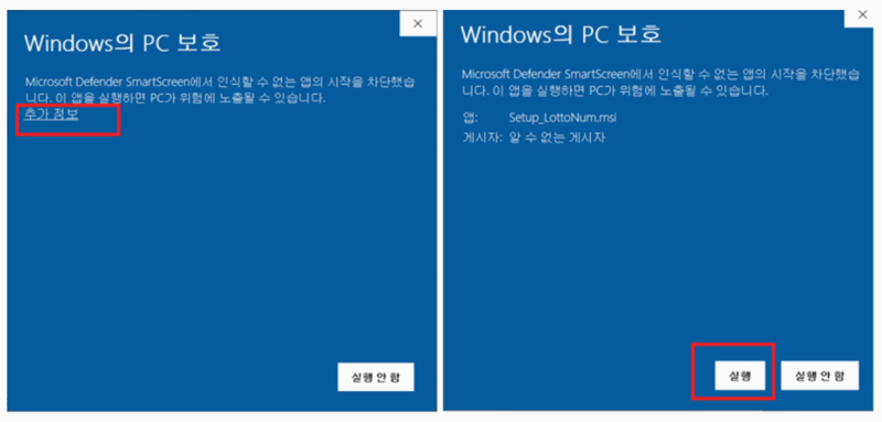 3. 설치 파일을 실행하면 윈도우 PC 보호 화면이 나타날 수 있습니다. 여기서 '추가 정보'를 누른 뒤 '실행'을 선택해야 계속 진행할 수 있어요.