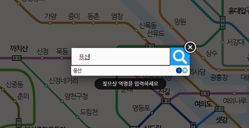 7. 검색창에 '용산'처럼 내가 찾으려는 역 이름을 입력하면, 바로 해당 역을 찾아 지도 위에 표시해 줍니다. 이를 통해 원하는 역의 급행 시간표를 더 빠르고 간편하게 확인할 수 있습니다.