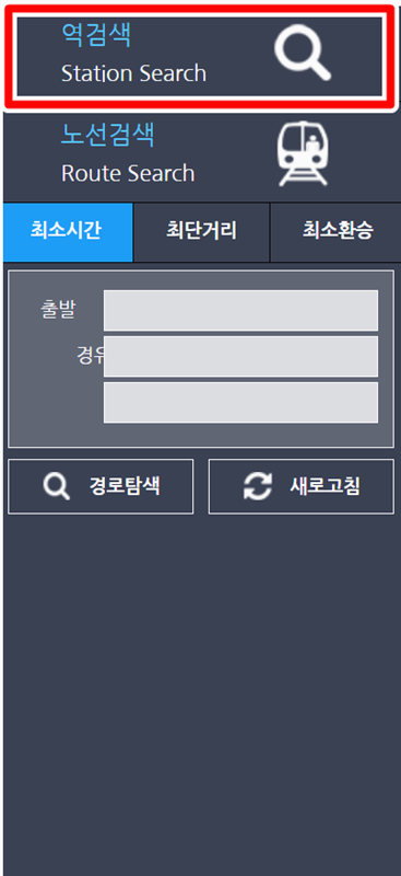 6. 지도를 일일이 움직여 찾기 번거롭다면, 왼쪽의 '역검색' 기능을 활용하는 것도 좋은 방법입니다. 돋보기 모양을 누르면 역 이름을 직접 입력할 수 있어요.