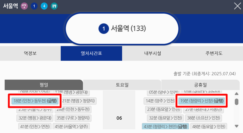 5. 열차 시간표 화면이 열리면 평일, 토요일, 공휴일로 나뉜 시간표를 볼 수 있습니다. 여기서 '급행'이라고 표시된 시간을 확인하면, 기다리지 않고 바로 급행열차를 이용할 수 있습니다.