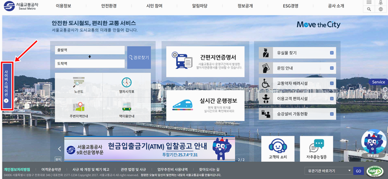 1. 서울교통공사 홈페이지 왼편에 있는 '사이버스테이션'으로 들어가면, 수도권 전철의 모든 정보를 담은 노선도를 만날 수 있습니다.