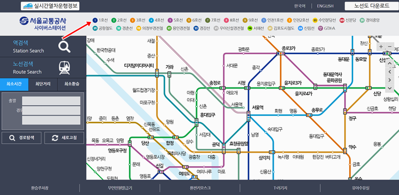 2. 전체 노선도가 나타나면, 상단에 있는 여러 호선 번호 중에서 '1호선'을 찾아 선택해 주세요. 그러면 해당 노선이 선명하게 표시됩니다.