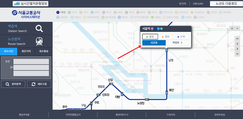 4. 노선도에서 서울역처럼 내가 타려는 역을 선택하면 작은 정보창이 나타납니다. 여기서 '시간표'를 누르면 해당 역의 상세한 운행 시각을 확인할 수 있어요.