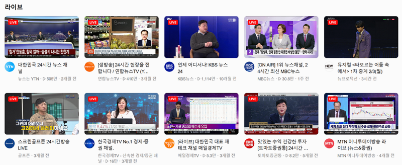 2. 무료로 볼 수 있는 실시간 채널에는 뉴스, 경제, 스포츠 등 다양한 분야가 포함되어 있어요. 라이브 방송은 LIVE라는 표시가 되어 있어 쉽게 구분할 수 있으며 원하는 프로그램을 골라서 시청할 수 있어요.