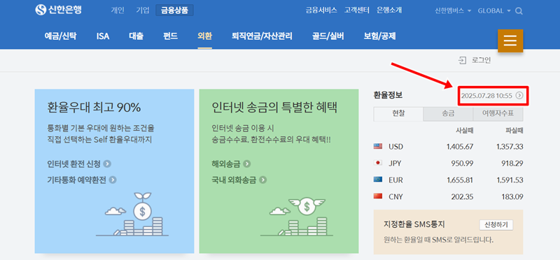 5. 다른 은행의 경우, 신한은행 홈페이지에서는 금융상품 메뉴 중 원화와 화살표가 그려진 '외환' 항목을 찾아 선택하면 됩니다.