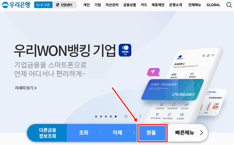 1. 우리은행 홈페이지에 들어와서 하단에 보이는 주요 메뉴 중 '환율'을 선택하면, 관련 정보를 확인할 수 있는 페이지로 이동합니다.