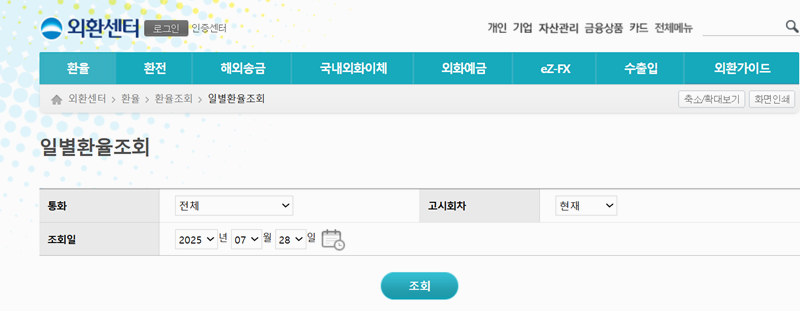 2. 환율 조회 화면에서 궁금한 통화를 선택하고, 달력 그림을 이용해 과거의 특정 날짜를 년, 월, 일 순서로 정확하게 지정한 뒤 조회합니다.