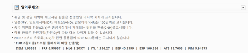4. 조회 결과 아래에는 참고할 만한 안내 사항들이 있습니다. 휴일의 환율 기준이나 특정 국가 통화의 고지 단위 같은 세부적인 내용을 확인할 수 있습니다.