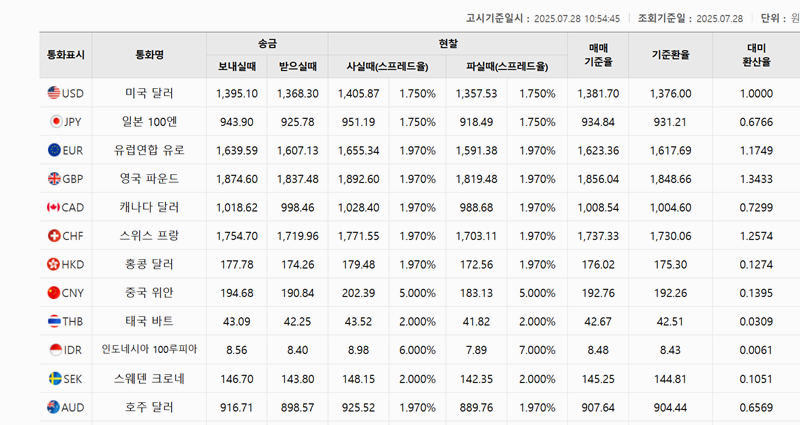 3. 조회를 마치면 지정한 날짜의 환율 정보가 표로 나타납니다. 미국 달러, 유로 등 각 통화별로 송금 보낼 때, 현찰 살 때 등 상세한 기준을 볼 수 있습니다.