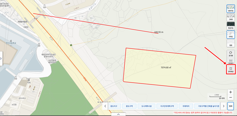 8. '면적계산' 기능을 이용하면 지도에서 원하는 영역을 직접 그려 그 넓이를 확인할 수 있습니다. 특정 필지의 대략적인 크기를 파악할 때 편리합니다.