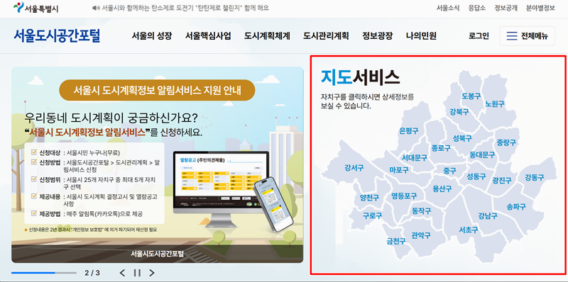 1. 홈페이지의 지도 서비스 화면에서 궁금한 자치구를 선택하면, 해당 지역의 상세 정보를 볼 수 있는 지도로 바로 이동하게 됩니다.