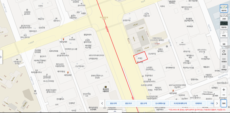 4. 지도를 확대하면 개별 필지와 건물의 모양, 지번과 같은 자세한 정보를 확인할 수 있어 주변의 지형지물까지 상세하게 살펴볼 수 있습니다.