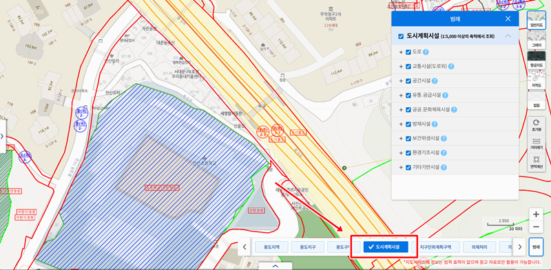 6. 이어서 '도시계획시설'을 확인하면 도로, 공원, 녹지 같은 기반 시설의 계획 현황이 지도 위에 겹쳐서 나타나 도시의 전체적인 골격을 파악하기 좋습니다.