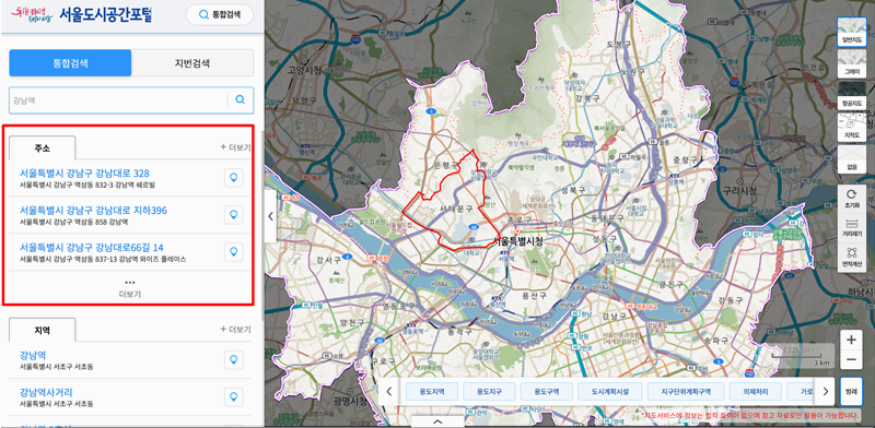 3. 찾으려는 장소를 입력하면 관련된 주소와 지역 목록이 나타나고, 여기서 원하는 항목을 고르면 지도가 해당 위치로 바로 이동합니다.