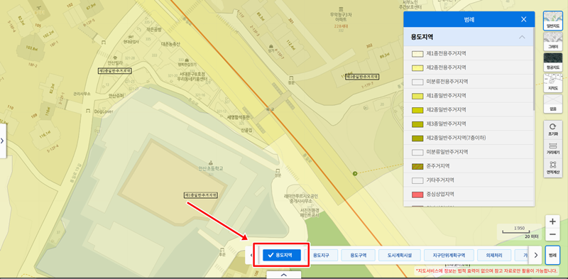 5. 화면 하단의 '용도지역'을 살펴보면 땅의 쓰임새가 색깔별로 구분되어 표시됩니다. 이를 통해 각 필지가 주거지역인지 상업지역인지 알 수 있습니다.