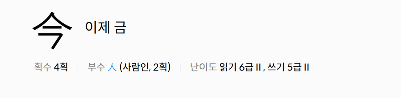 5. 궁금한 한자를 선택하면 더 상세한 화면으로 이동하여, 해당 글자의 모양과 함께 획수, 부수, 급수와 같은 자세한 정보를 볼 수 있습니다.