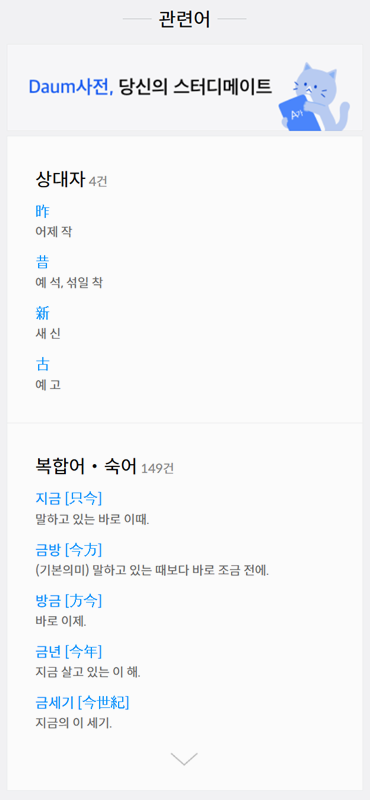 7. 더 아래에서는 상대자, 복합어, 숙어 등 해당 한자와 연관된 다른 단어들을 함께 살펴볼 수 있어 어휘력을 넓히는 데 도움이 됩니다.