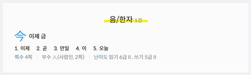 3. 검색 결과에서는 먼저 입력한 음에 해당하는 한자(음/한자)가 나타나며, 대표적인 뜻과 획수, 부수 등의 기본 정보를 보여줍니다.