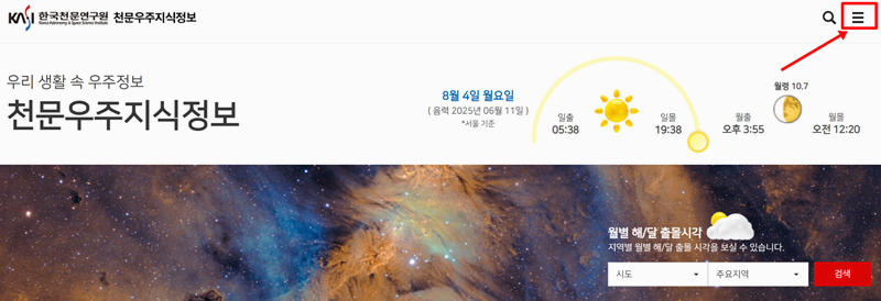 1. 홈페이지 오른쪽 위에 보이는 세 줄 모양의 전체 메뉴를 누르면 숨겨져 있던 사이트맵이 나타납니다. 이곳에서 필요한 모든 항목을 한눈에 찾아볼 수 있습니다.