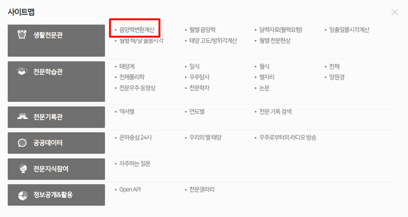 2. 나타난 전체 메뉴에서 '생활천문관' 항목을 찾고, 그 아래에 있는 '음양력변환계산'을 선택해 주세요. 그러면 날짜를 변환할 수 있는 페이지로 이동하게 됩니다.