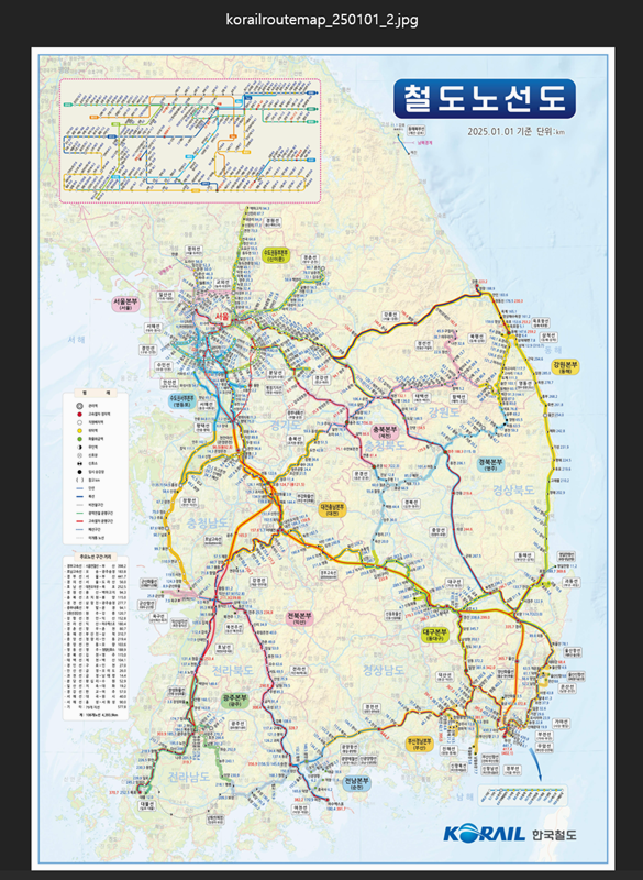 4. 내려받은 노선도 파일은 우리나라 전체 철도망을 담은 고화질 이미지입니다. 수도권 전철부터 KTX, 일반 열차 노선까지 모든 철도가 알기 쉽게 표시되어 있어 전국적인 이동 경로를 파악하는 데 매우 유용하게 쓰입니다.
