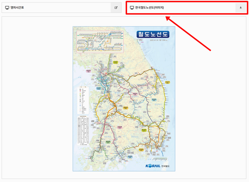 3. 열차시간표 안내 페이지에 접속하면 '한국철도노선도(이미지)' 파일을 발견할 수 있습니다. 오른쪽에 위치한 내려받기 기능을 이용해 노선도 이미지 파일을 PC나 모바일 기기에 저장해두고 필요할 때마다 편리하게 열어볼 수 있습니다.