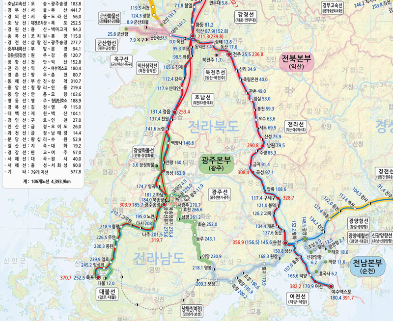 5. 전체 노선도에서 전라남도와 전라북도 지역을 확대해 보면, 익산에서 시작해 여수까지 이어지는 전라선 노선을 아주 상세하게 확인할 수 있습니다. 각 역의 위치와 연결 관계가 명확하게 보여 여행 계획을 세우는 데 큰 도움이 됩니다.