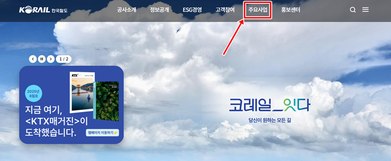 1. 시작점은 코레일 홈페이지 메인 화면입니다. 상단에 있는 여러 메뉴 중에서 '주요사업'을 찾으면, 여객 수송뿐만 아니라 물류, 자산 개발 등 코레일의 다양한 활동에 대한 정보를 얻을 수 있습니다.