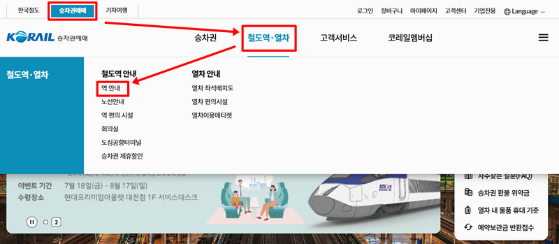 6. 다른 방법으로, 코레일 예매 전문 사이트인 '레츠코레일'에서도 역 정보를 찾아볼 수 있습니다. 홈페이지 상단의 '승차권 예매'를 거쳐 '철도·열차'로 이동한 뒤, '역 안내' 항목을 통해 전국 역에 대한 정보를 확인하는 경로도 있습니다.