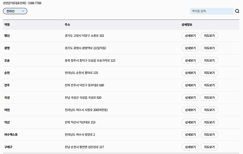 7. 전라선을 선택하면 행신, 광명, 오송, 순천, 여수엑스포 등 해당 노선이 지나는 모든 역의 목록과 주소를 한 번에 볼 수 있습니다. 각 역의 '상세보기'를 통해 더 구체적인 정보를 얻거나 '지도보기'로 위치를 바로 파악할 수도 있습니다.